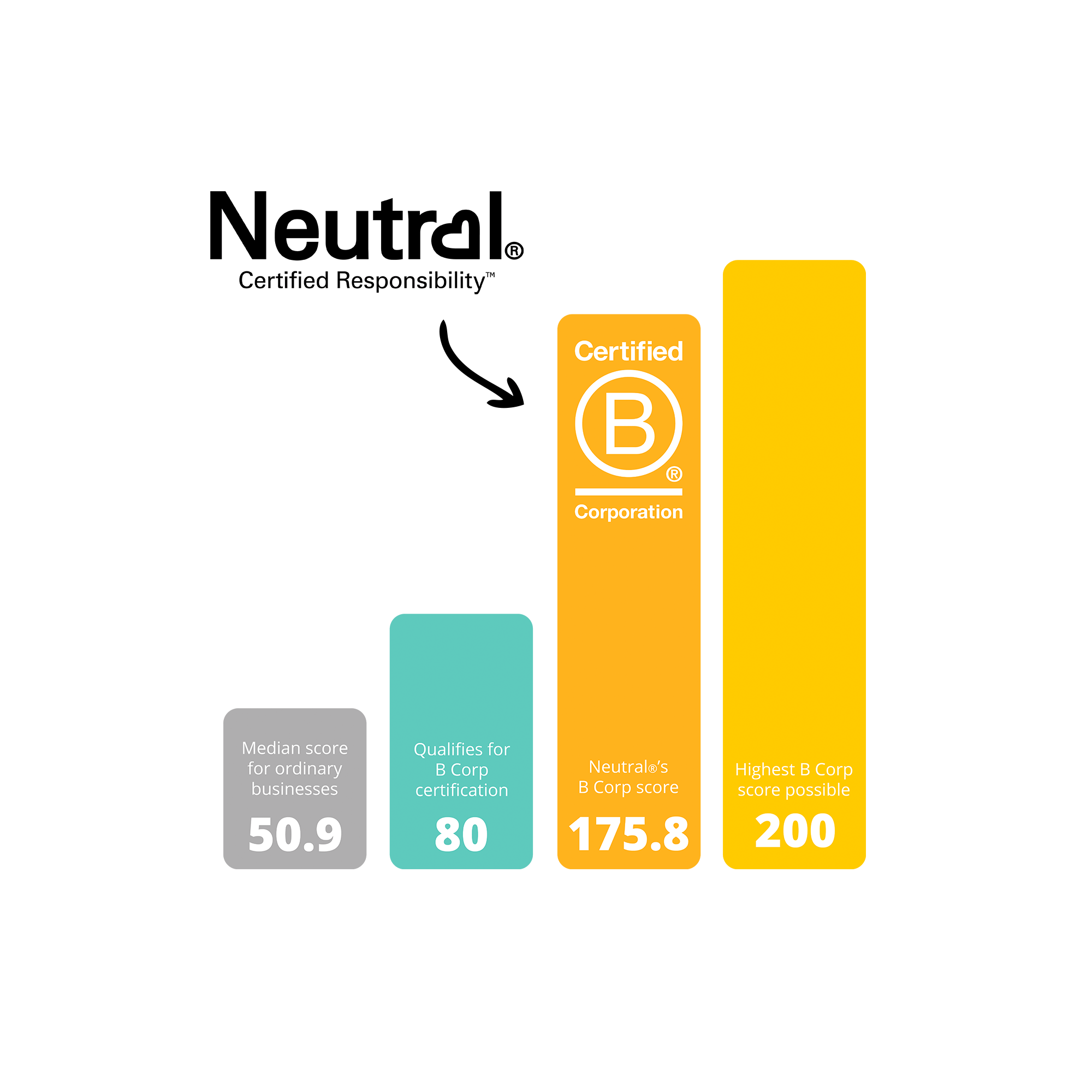 B Corp doesn’t certify our products, but Neutral® as a whole. We have earned the highest score in the EU by documenting our real world impact on the world. There are 2307 B Corps in EU. You need 80 points to be certified as a B Corp. Neutral got a score of 175,8.