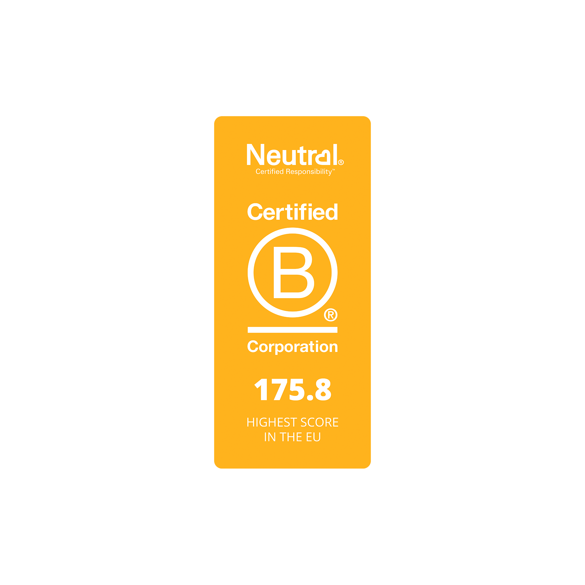 B Corp doesn’t certify our products, but Neutral® as a whole. We have earned the highest score in the EU by documenting our real world impact on the world. There are 2307 B Corps in EU. You need 80 points to be certified as a B Corp. Neutral got a score of 175,8.